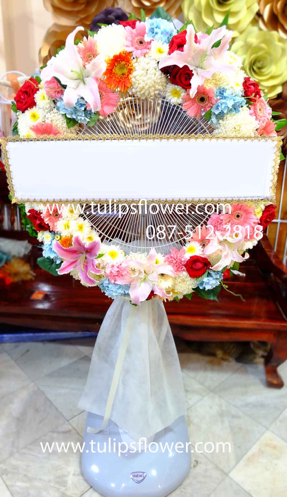 หรีดพัดลมตั้งโต๊ะ หน้ากว้าง 16 นิ้ว ของฮาตาริ(ดอกไม้สด สามารถปรับเปลียนสีได้ตามต้องการ)